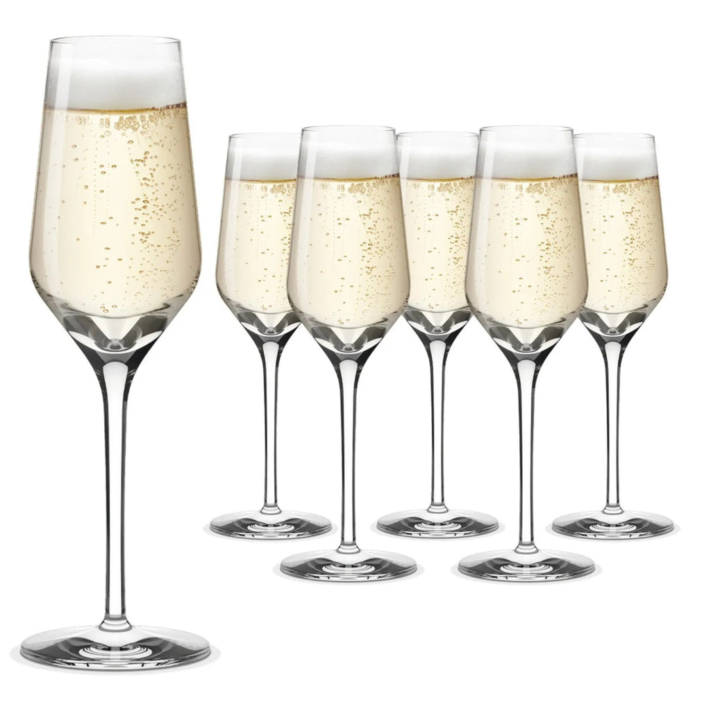 Copa flute de cristal con capacidad de 248 ml. Su forma alargada mantiene burbujas y frescura en champañas y espumantes. El cristal fino potencia la elegancia y transparencia, ideal para celebraciones y mesas de lujo.