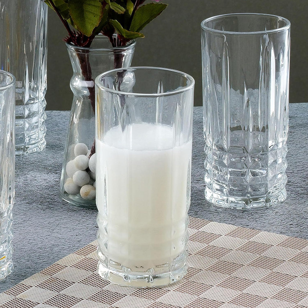 Vaso alto Rollins de vidrio, capacidad de 380 ml. Perfecto para refrescos, agua o tragos largos. Diseño elegante y funcional.