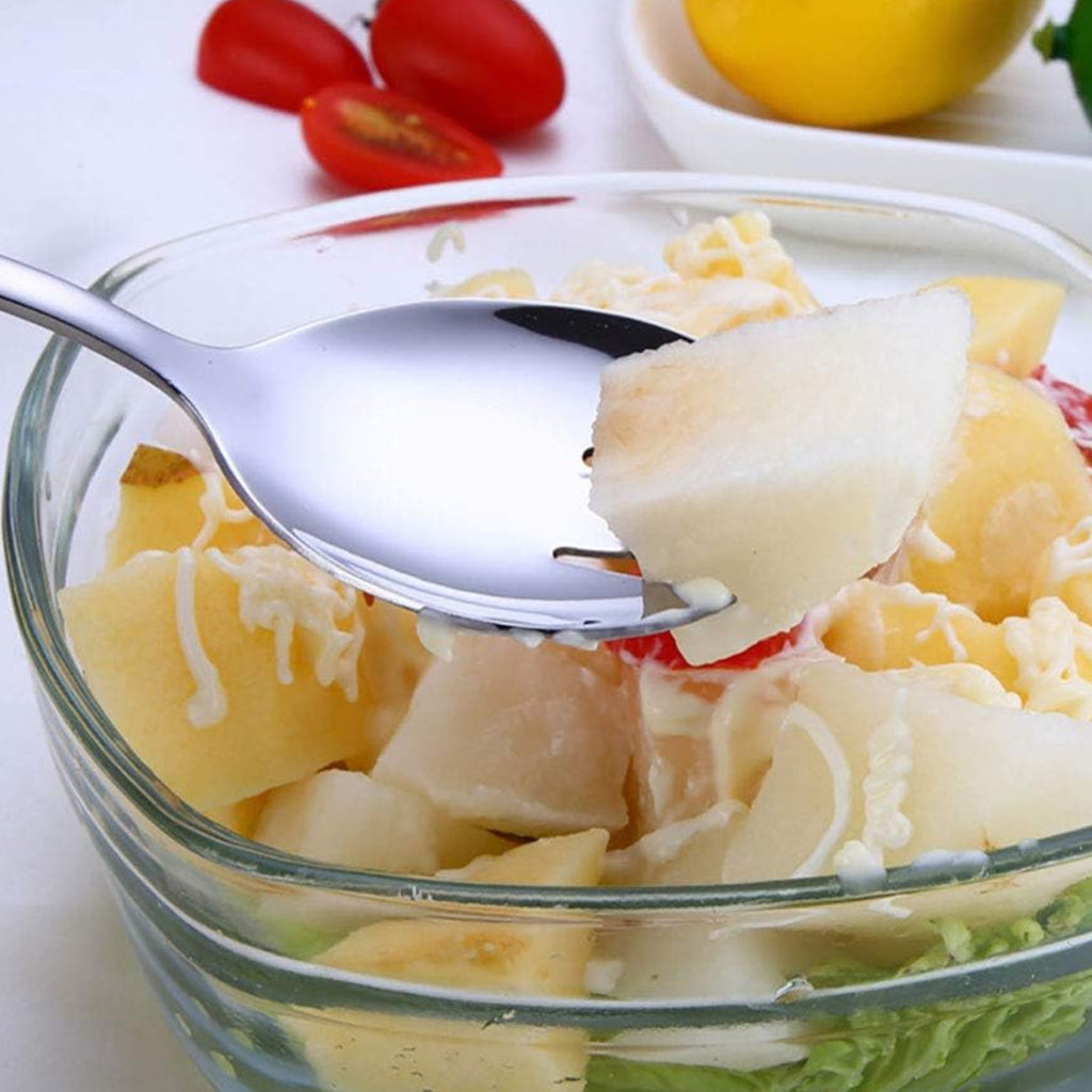 Set de 2 cucharas para ensalada de 25 cm de largo, fabricadas en acero inoxidable resistente a la corrosión. Su tamaño permite mezclar y servir ensaladas con comodidad, manteniendo distancia adecuada de los alimentos. El acero inoxidable facilita la limpieza y ofrece mayor durabilidad frente a utensilios plásticos. Diseño funcional y elegante, ideal para uso doméstico o gastronómico. Una opción práctica para servir con estilo y resistencia en cada comida.
